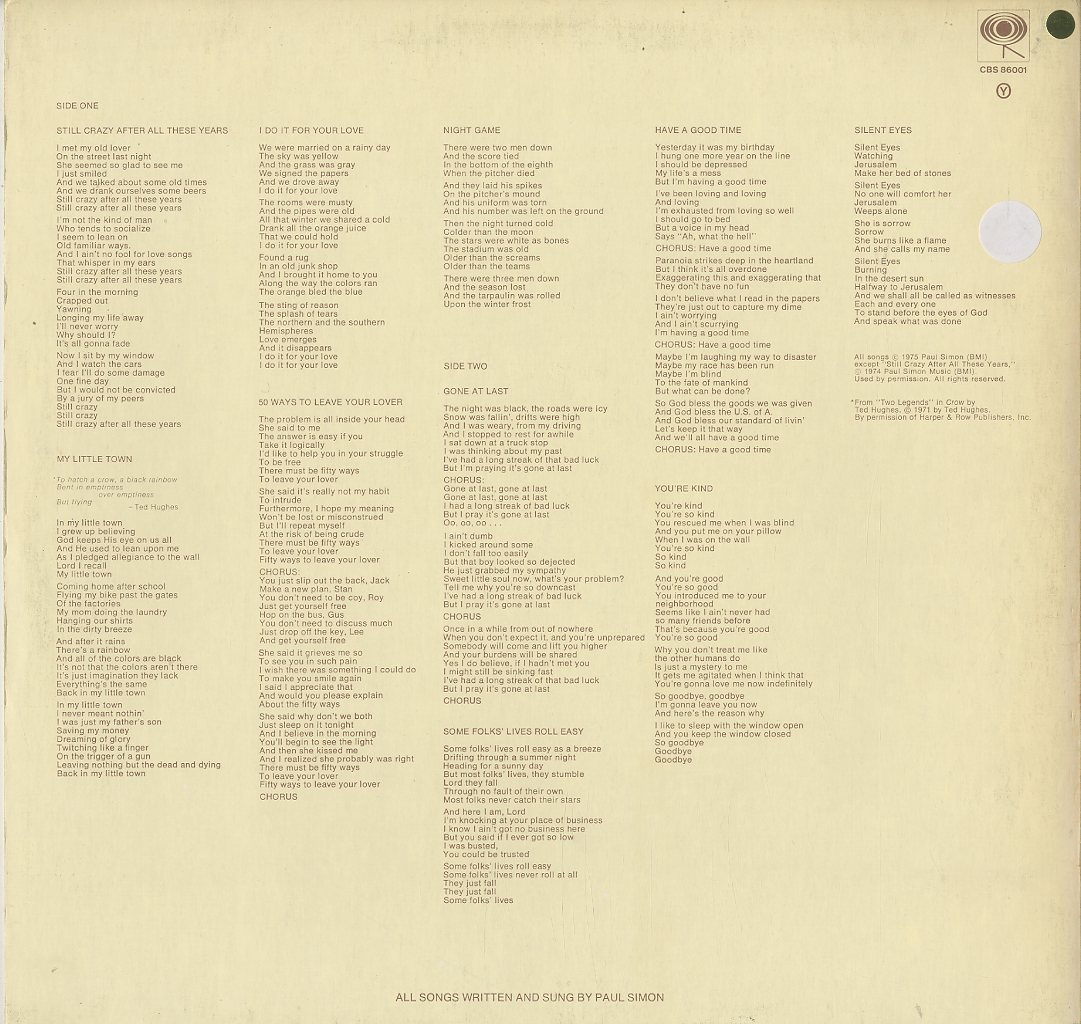 Discographie von Paul Simon![]() CBS CBS 86001 Paul Simon Still Crazy After All These Years Eintrag bei DISCOGS (extern) NL 1975, LP, Pop/Rock Aufnahme: Stereo Zustand: m- / vg+ sowie 50 Ways To Leave Your Lover u.a. Texte auf Cover-Rückseite, Musiker auf Innenhülle Diese Platte ist zur Zeit vergriffen. | ![]() Coveransicht: Paul Simon - Still Crazy After All These Years ![]()