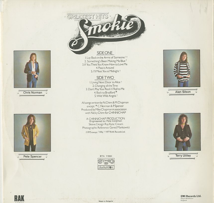 | Discographie von Smokie Balkaton 11004 (Blue Label) Smokie Greatest Hits Eintrag bei DISCOGS (extern) BULG 1983, LP, Pop/Rock Aufnahme: Stereo Zustand: vg+ bis m- / vg++ mit Lay Back In The Arms Of Someone (1977); Somethings Been Making Me Blue (1976); If You Think You Know How To Love Me(75); Living Next Door To Alice (1976) u.a. Diese Platte ist zur Zeit vergriffen. | ![]() Coveransicht: Smokie - Greatest Hits ![]()