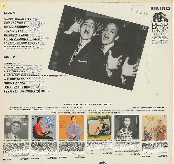Discographie von Kalin Twins![]() Bear Family Records BFX 15122 Kalin Twins When Eintrag bei DISCOGS (extern) D 1983, LP, US-Rock Aufnahme: Stereo Zustand: vg+ / vg (Rücks. viele Anm.) sowie Forget Me Not, A Picture Of You u.a. When Original Vocalion 1958 Diese Platte ist zur Zeit vergriffen. | ![]() Coveransicht: Kalin Twins - When ![]()