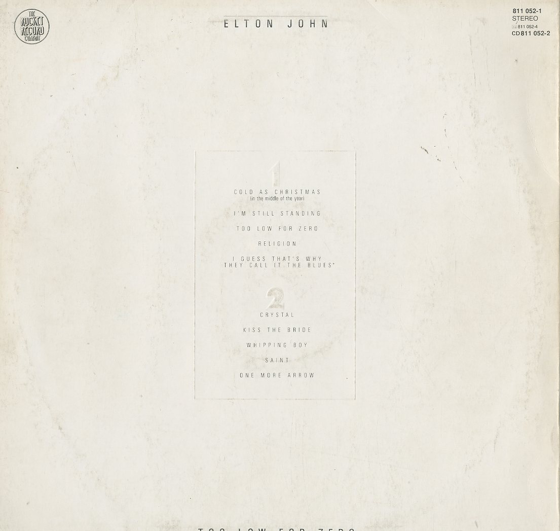 Discographie von Elton John![]() Rocket Rec.Co 811 052-1 Elton John Too Low For Zero Eintrag bei DISCOGS (extern) NL 1983, LP, Pop/Rock Aufnahme: Stereo Zustand: vg+ / vg (ringwear and price sticker) sowie Cold As Christmas; I´m Still Standing; I Guess That´s Why They Call It The Blues u.a. Texte auf Innenhülle Preis in Euro: 4,00 € Verfügbarkeitsanfrage | ![]() Coveransicht: Elton John - Too Low For Zero ![]()