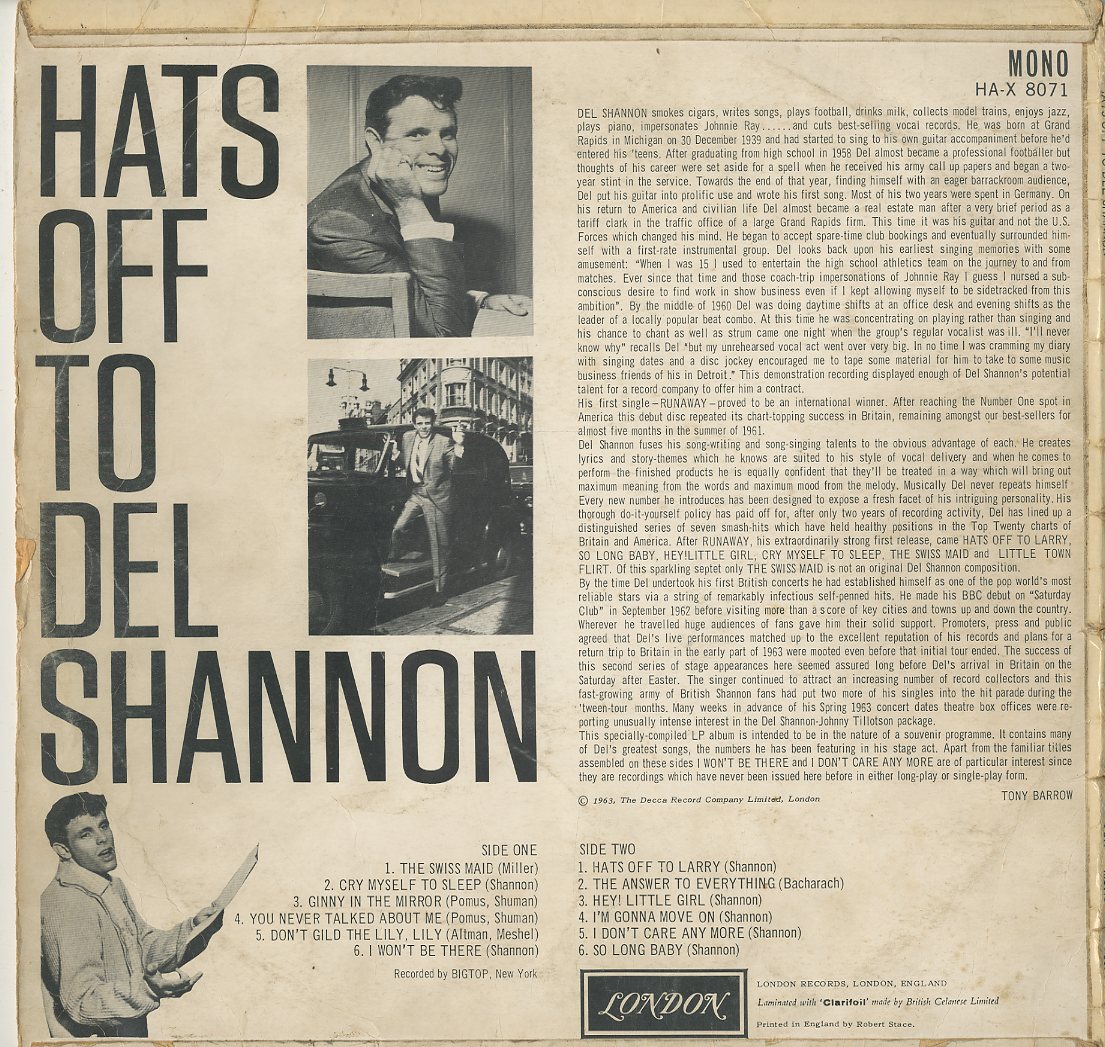 Discographie von Del Shannon![]() London HA-X 8071 Del Shannon Hats Off To Del Shannon Eintrag bei DISCOGS (extern) UK 1963, LP, US-Rock Aufnahme: Mono Zustand: vg / g+ mit Hats Off To Larry, The Swiss Maid; Cry Myself To Sleep; Ginny In The Mirror; The Answer To Everything; Hey Little Girl; So Long Baby u.a. Diese Platte ist Bestandteil meiner Top 100. Nicht verkäuflich. | ![]() Coveransicht: Del Shannon - Hats Off To Del Shannon ![]()