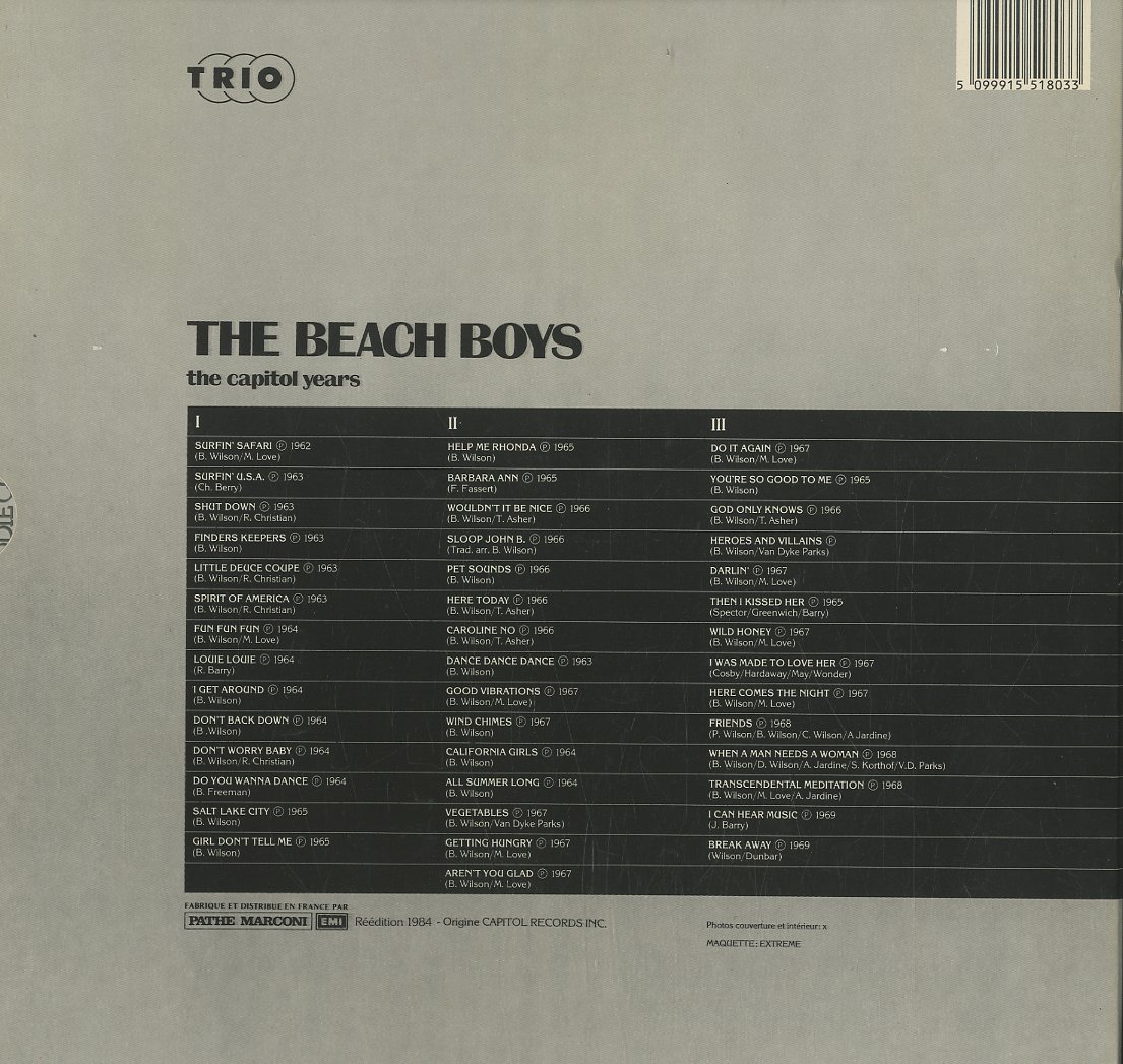 Discographie von The Beach Boys![]() Capitol 1551803 The Beach Boys The Capitol Years (3 Record Box Set) Eintrag bei DISCOGS (extern) F 1984, LP, US-Rock Aufnahme: Stereo Zustand: vg+ / vg++ Alle Hits 1962 -1969 im Schuber, Von Surfin Safari über I Get Around und Help Me Rhonda bis Heroes And Villains undI Can Hear Music Diese Platte ist zur Zeit vergriffen. | ![]() Coveransicht: The Beach Boys - The Capitol Years (3 Record Box Set) ![]()