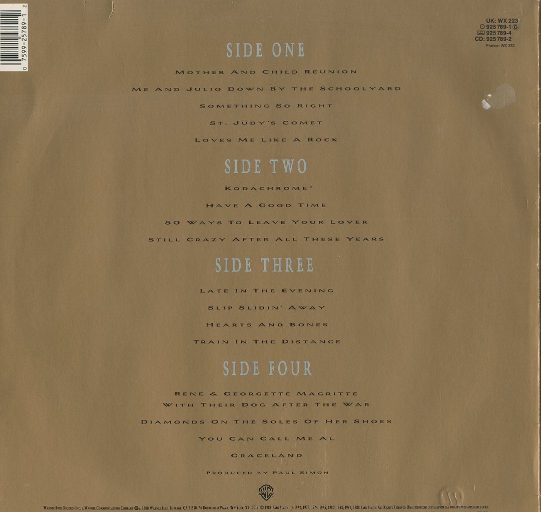 Discographie von Paul Simon![]() Warner Bros Records 925 789-1 Paul Simon Negotiations And Love Songs 1971 - 1986 (DLP) Eintrag bei DISCOGS (extern) D 1988, LP, Pop/Rock Aufnahme: Stereo Zustand: vg+ bis m- / vg++ mit Mother And Child Reunion; Me And Julio Down By The School Yard; Loves Me Like A Rock; 50 Ways To Leave Your Lover Texte auf Innenhülle Diese Platte ist zur Zeit vergriffen. | ![]() Coveransicht: Paul Simon - Negotiations And Love Songs 1971 - 1986 (DLP) ![]()