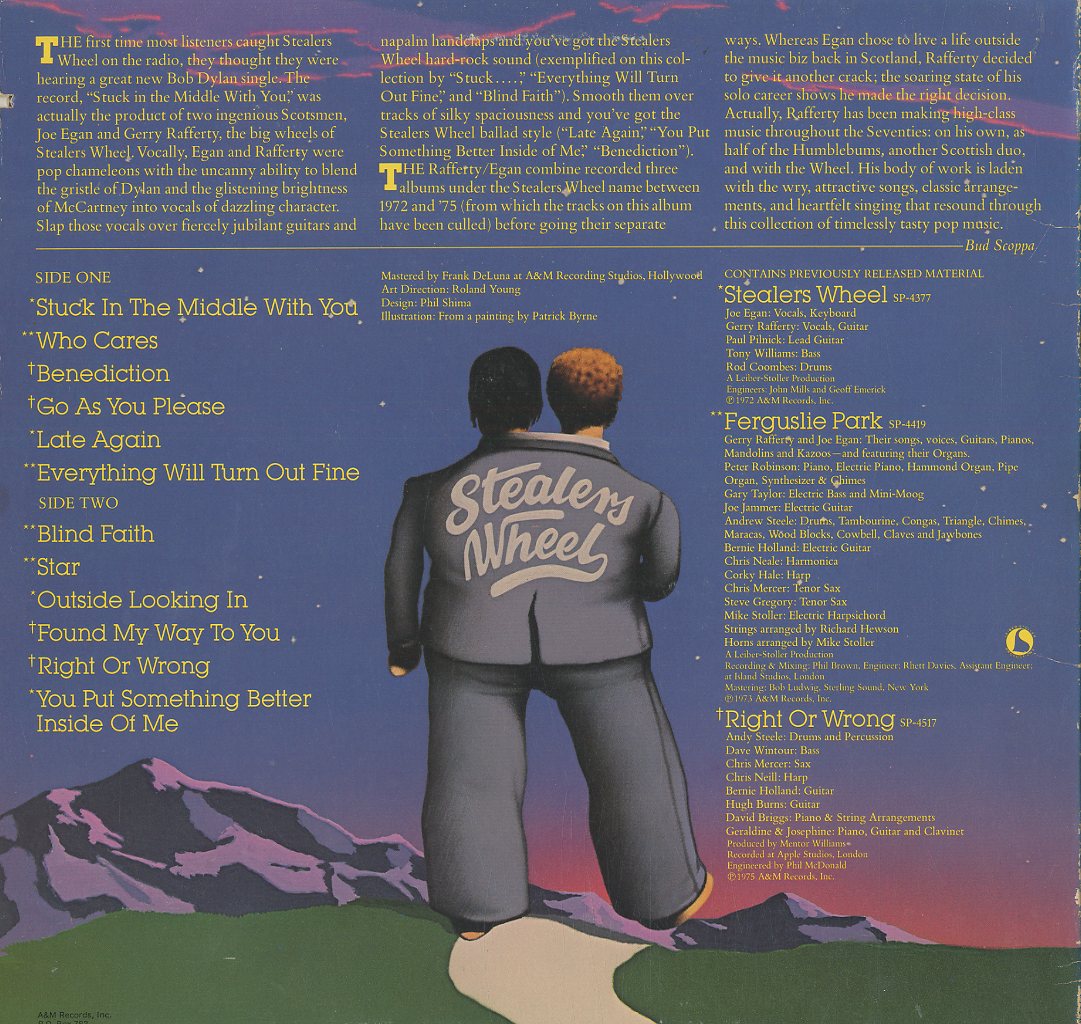 Discographie von Stealers Wheel![]() A&M SP 4708 Stealers Wheel Stuck in the Middle With You - The Best of Stealers Wheel Eintrag bei DISCOGS (extern) US RI (Orig. 1978, LP, Pop/Rock Aufnahme: Stereo Zustand: vg+ / vg+ (Cut out -kl.Schnitt) sowie Blind Faith, Outside Looking In u.a. Gerry Rafferty And Joe Egan Preis in Euro: 4,50 € Verfügbarkeitsanfrage | ![]() Coveransicht: Stealers Wheel - Stuck in the Middle With You - The Best of Stealers Wheel ![]()