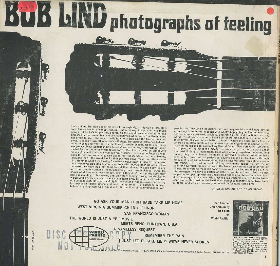 Discographie von Bob Lind![]() World Pacific WP 1851 Bob Lind Photographs Of Feeling Eintrag bei DISCOGS (extern) US 1966, LP, C&W/Folk Aufnahme: Stereo Zustand: vg+ / Cover vg - (Disc Jockey Copy) including I Just Let It Take Me, Remember The Rain u.a. Preis in Euro: 4,50 € Verfügbarkeitsanfrage | ![]() Coveransicht: Bob Lind - Photographs Of Feeling ![]()