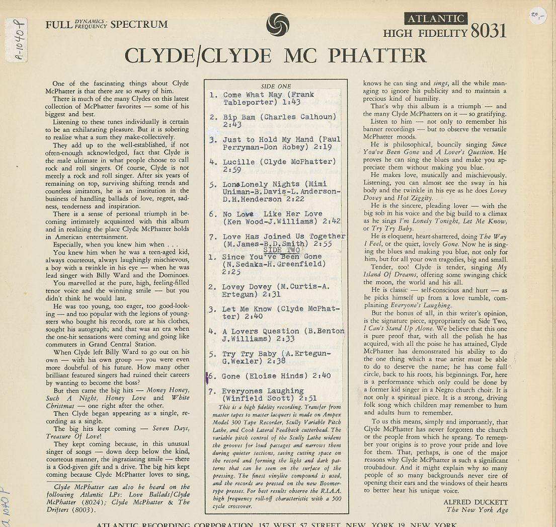 Discographie von Clyde McPhatter![]() Atlantic P 4584 / Cover 8031 Clyde McPhatter Clyde (Jap. Ed) Eintrag bei DISCOGS (extern) JP RI 1980 (Orig, 1959), LP, R&B/Soul/Blues Aufnahme: Mono Zustand: m- Katalogpreis: 25,90 € (2009) u.a. Since You´ve Been Gone, A Lovers Question, Try Try Try Titelliste überklebt, Titel mit Schreibmaschine geschrieben, weil angegebene Reihenfolge nicht stimmt und z.T. andere Titel auf der LP sind Beiblatt mit Texten Diese Platte ist zur Zeit vergriffen. | ![]() Coveransicht: Clyde McPhatter - Clyde (Jap. Ed) ![]()
