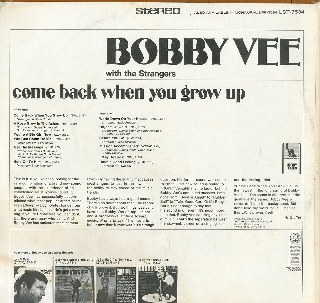 Discographie von Bobby Vee![]() Liberty LST 7534 Bobby Vee Come Back When You Grow Up Eintrag bei DISCOGS (extern) US 1967, LP, US-Rock Aufnahme: Stereo Zustand: m / vg+ sowie You Can Count On Me, Before You Go u.a. Preis in Euro: 7,00 € Verfügbarkeitsanfrage | ![]() Coveransicht: Bobby Vee - Come Back When You Grow Up ![]()