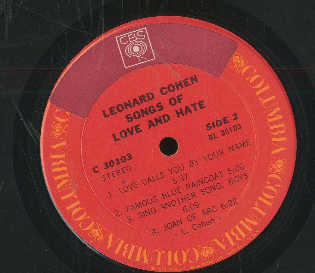 | Discographie von Leonard Cohen Columbia /CBS C 30103 Leonard Cohen Songs Of Love And Hate Review der Schallplatte (extern) Eintrag bei DISCOGS (extern) US 1975, LP, Easy Listening Aufnahme: Stereo Zustand: vg / vg u.a. Avalanche, Last years Man, Dress Rehearsal Rag, Diamonds In the Mine, Suzanne, Sisters of Mercy, Bird On The Wire Label Umgeklebt von Columbia auf CBS Preis in Euro: 2,50 € Verfügbarkeitsanfrage | ![]() Coveransicht: Leonard Cohen - Songs Of Love And Hate ![]()