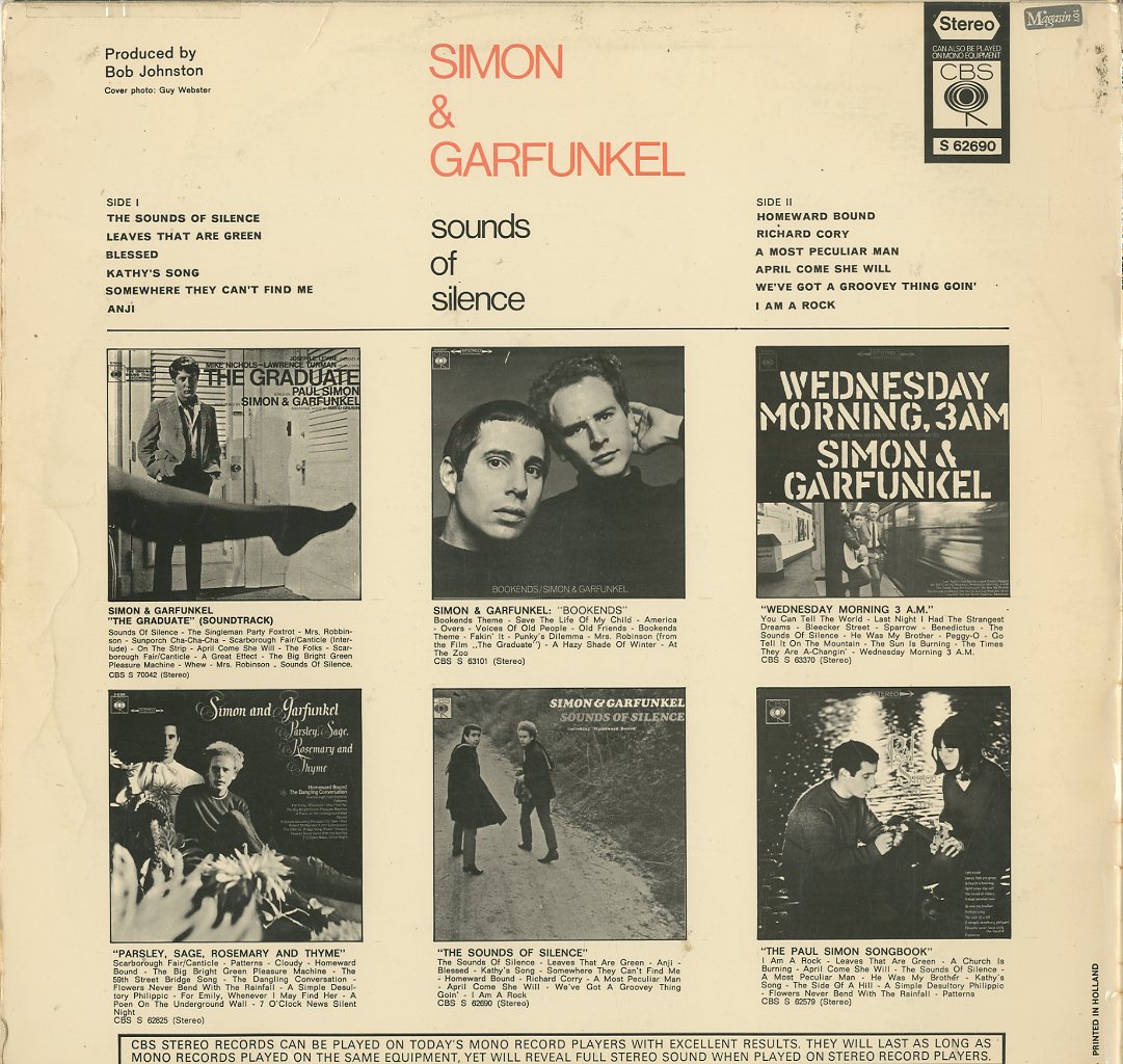 Discographie von Simon & Garfunkel![]() CBS S 62690 Simon & Garfunkel Sounds of Silence -Including Homeward Bound Eintrag bei DISCOGS (extern) NL 1968, LP, Pop/Rock Aufnahme: Stereo Zustand: vg (-) / vg(+) u.a. The Sound Of Silence; I Am A Rock; Kathy´s Songsowie Homeward Bound Diese Platte ist zur Zeit vergriffen. | ![]() Coveransicht: Simon & Garfunkel - Sounds of Silence -Including Homeward Bound ![]()