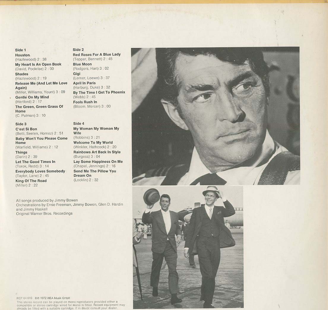 Discographie von Dean Martin![]() Reprise REP 64010-1/2 Dean Martin The Most Beautiful Songs of Dean Martin (DLP) Eintrag bei DISCOGS (extern) D RI 1977 (Orig. 1972), LP, Easy Listening Aufnahme: Stereo Zustand: vg+ bis m-/ vg (vorne besch.) mit Houston, Gentle On Mind, Everybody Loves Somebody u.a. Klappcover mit sw-Fotos Diese Platte ist Bestandteil meiner Top 100. Nicht verkäuflich. | ![]() Coveransicht: Dean Martin - The Most Beautiful Songs of Dean Martin (DLP) ![]()