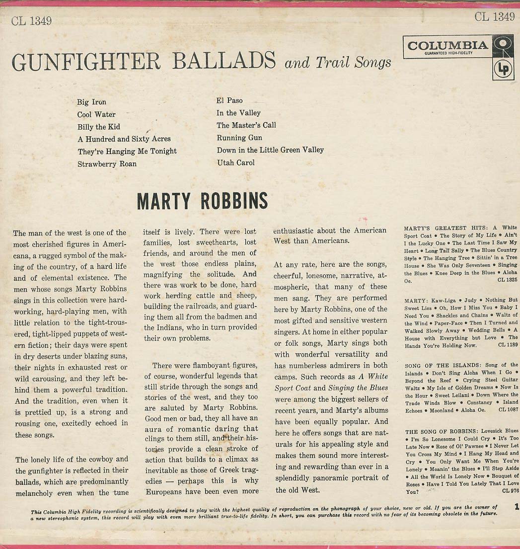 Discographie von Marty Robbins![]() Columbia CL 1349 Marty Robbins Gunfighter Ballads and Trail Songs Eintrag bei DISCOGS (extern) US 1959, LP, C&W/Folk Aufnahme: Stereo Zustand: vg (+) /vg (+) mit El Paso, Cool Water u.a. Pitman Pressing Diese Platte ist Bestandteil meiner Top 100. Nicht verkäuflich. | ![]() Coveransicht: Marty Robbins - Gunfighter Ballads and Trail Songs ![]()