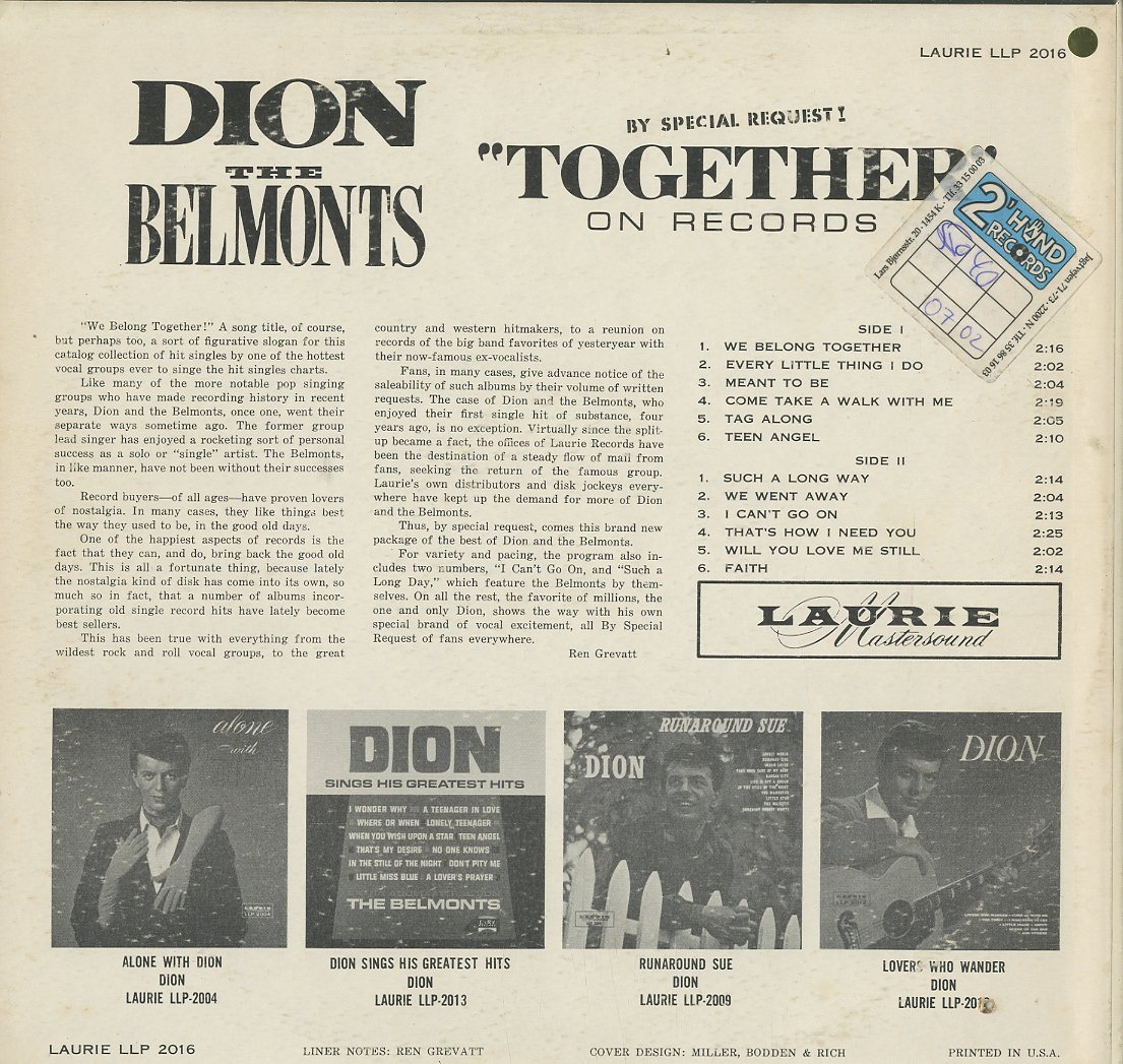 Discographie von Dion![]() Laurie LLP 2016 Dion By Special Request Dion And The Belmonts Together On Records Eintrag bei DISCOGS (extern) US 1963, LP, US-Rock Aufnahme: Mono Zustand: vg+ / vg (Abrieb) [There was no reunion of the group for this album, just a release of previously recorded songs],I Cant Go On + Such A Long Way [The Belmonts alleine) 1960 Trennung Diese Platte ist zur Zeit vergriffen. | ![]() Coveransicht: Dion - By Special Request Dion And The Belmonts Together On Records ![]()