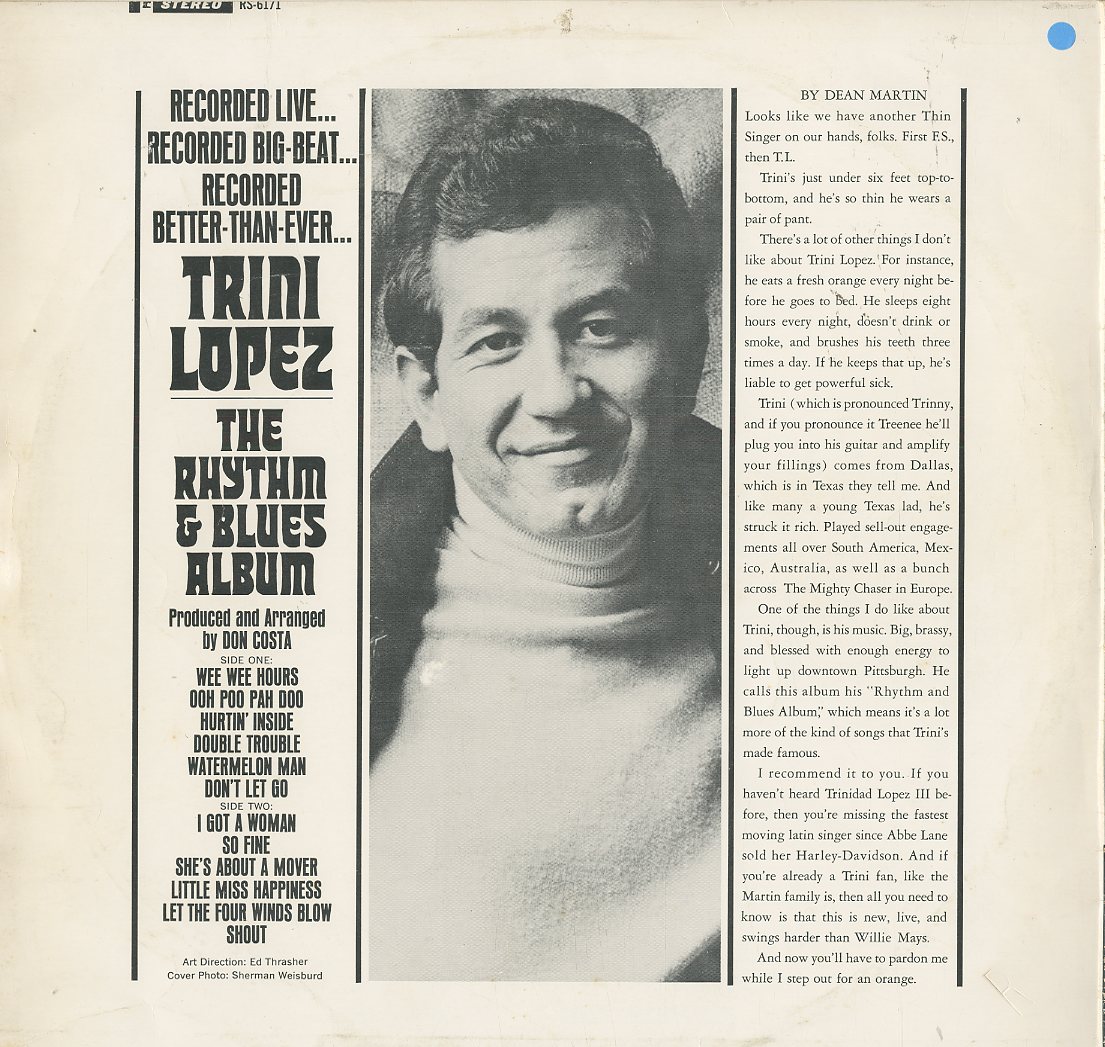 Discographie von Trini Lopez![]() Reprise RS 6171 Trini Lopez The Rhythm & Blues Album Eintrag bei DISCOGS (extern) D 1965, LP, Easy Listening Aufnahme: Stereo Zustand: vg / vg++ u.a. Ooh Poo Pah Doo, Watrermelon Man, So Fine, Shout Preis in Euro: 4,00 € Verfügbarkeitsanfrage | ![]() Coveransicht: Trini Lopez - The Rhythm & Blues Album ![]()
