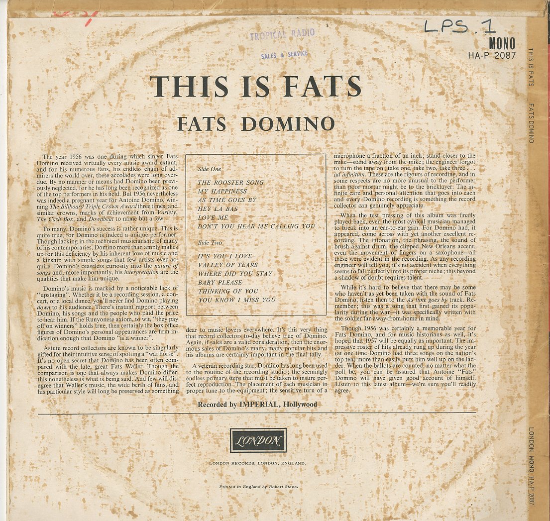 Discographie von Fats Domino![]() London HA-P 2087 Fats Domino This Is Fats Eintrag bei DISCOGS (extern) UK 1959 (2(n Press, first 1957), LP, US-Rock Aufnahme: Mono Zustand: vg+ / Cover g (Rücks.stark fleckig -> Foto) u.a. My Happiness, As Time Goes By, Hey La Bas (Original 1958) Diese Platte ist zur Zeit vergriffen. | ![]() Coveransicht: Fats Domino - This Is Fats ![]()