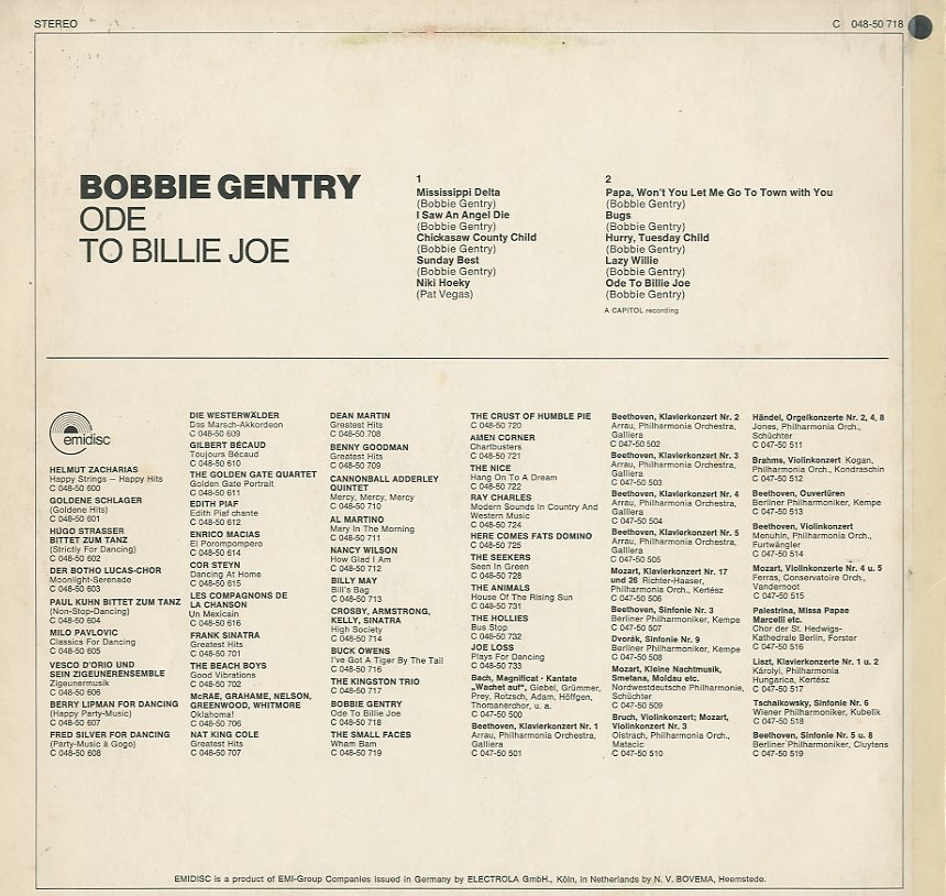 Discographie von Bobbie Gentry![]() emidisc 6E 048-50 718 Bobbie Gentry Ode To Billie Joe Eintrag bei DISCOGS (extern) DK 1970 (Orig. 1966), LP, Pop/Rock Aufnahme: Stereo Zustand: m- / vg+ sowie Mississippi Delta, Niki Hokey u.a.m. Diese Platte ist zur Zeit vergriffen. | ![]() Coveransicht: Bobbie Gentry - Ode To Billie Joe ![]()