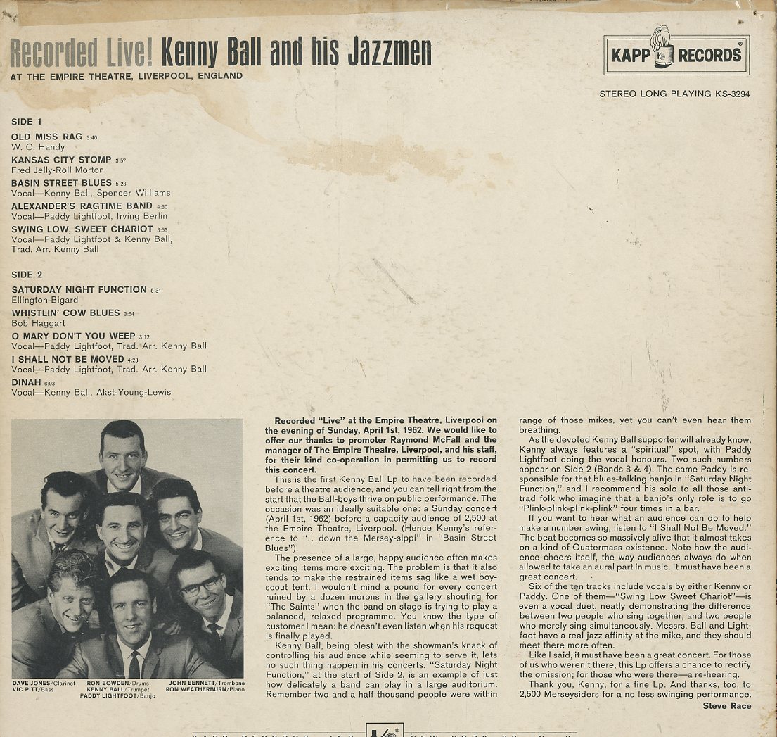 Discographie von Kenny Ball And His Jazzmen![]() Kapp KS 3294 Kenny Ball And His Jazzmen Recorded Live Eintrag bei DISCOGS (extern) US 1962, LP, Jazz Aufnahme: Stereo Zustand: vg+ / vg (Smiley Sticker, Rücks. Kaffeflecken) Recorded April 1st, 1962 at the Empire Theatre Liverpool, England, u.a. Saturday Night Function, I Shall Not Be Moved, Dinah, Swing Low Sweet Chariot Original in UK Als The Kenny Ball Show erschienen Preis in Euro: 4,00 € Verfügbarkeitsanfrage | ![]() Coveransicht: Kenny Ball And His Jazzmen - Recorded Live ![]()